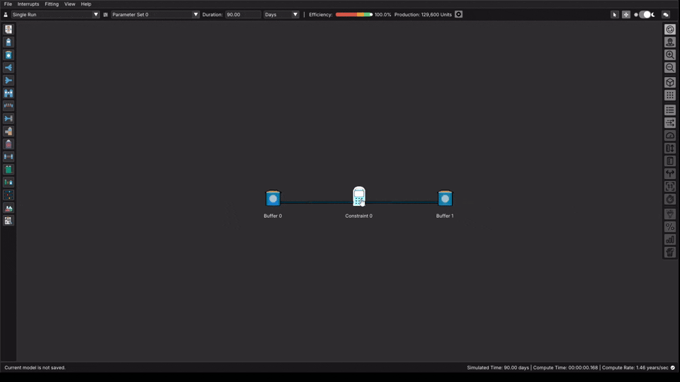 When we build models in ReliaSim, we start and end with infinite capacity buffers. The starting buffer is infinite capacity and infinitely full, while the ending buffer is infinite capacity and starts empty. This is basically a simple assumption for the sake of the model. We assume we'll have material to process, and it will have somewhere to go. When you first start ReliaSim, or open a new file, you'll be greeted by a model with these two buffers sandwiching a constraint. This is a great starting place to build our model from.